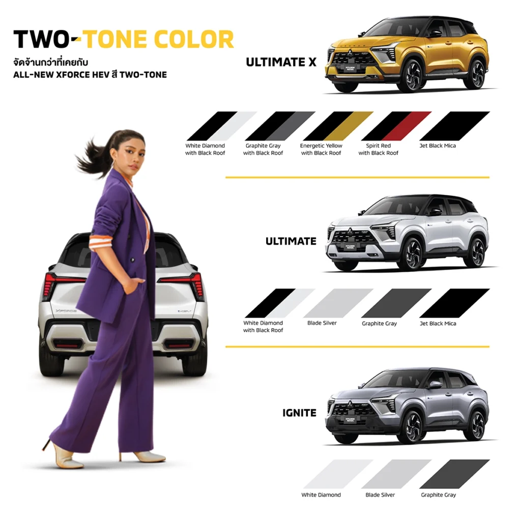 ด้วย 3 รุ่นย่อย และตัวเลือกสีที่หลากหลาย XFORCE HEV จึงเป็นหนึ่งในตัวเลือก SUV ไฮบริดที่ตอบโจทย์คนรักรถยุคใหม่ — ทั้งด้านสมรรถนะ ความประหยัด และความเป็น SUV สำหรับการใช้งานในชีวิตประจำวันและท่องเที่ยวได้อย่างลงตัว